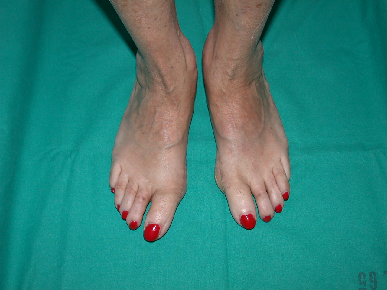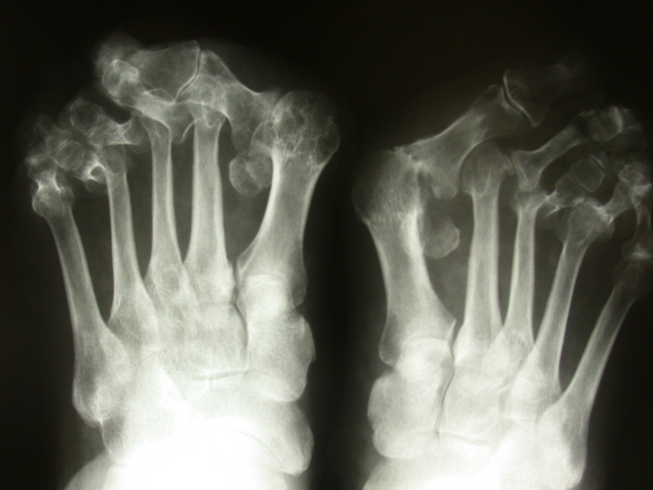 Tipicamente l’esordio è caratterizzato da dolori articolari accompagnati da tumefazione e rigidità che interessano le articolazioni di mani e piedi in maniera simmetrica ed aggiuntiva (cioè interessamento di altre articolazioni senza regressione nelle sedi già colpite). A livello del piede le articolazioni più frequentemente interessate sono le metatarso-falangee cioè le articolazioni alla base delle dita che vanno spesso incontro a lussazione patologica ; con minor frequenza sono interessate le articolazioni del retropiede e della caviglia (tra astragalo e scafoide , tra astragalo e calcagno, tibiotarsica). Se non adeguatamente trattata compaiono ipertrofia sinoviale ed erosioni dei capi articolari che comportano caratteristiche deformità ; in particolare all’avampiede si realizza spesso deformità in valgismo (cioè verso l’esterno) dell’alluce e delle dita laterali. Al retropiede il problema più comune è la comparsa di un progressivo piattismo che può arrivare a situazioni molto gravi per instabilità delle articolazioni interessati e per progressivo cedimento delle strutture tendinee , in particolare del tibiale posteriore.